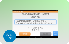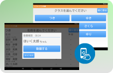 タブレットには現在の時刻と「登園」「降園」の区別が表示されています。 - タブレットに接続されているICリーダーにICタグをかざすと「登園」または「降園」した時刻が記録されます。